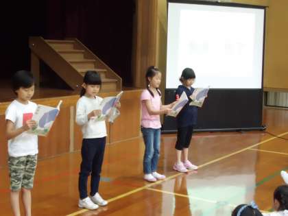 その後はフレッシュタイムです。3年生が国語の教科書から「きつつきの商売」の一部を音読発表しました。恥ずかしい気持ちもあるけれど,それに負けず,みんなの前でしっかり発表できる,そんな力をこれからもつけていってほしいと思います。