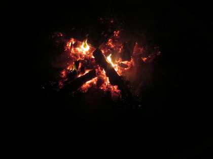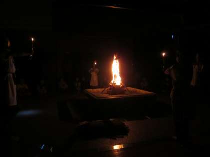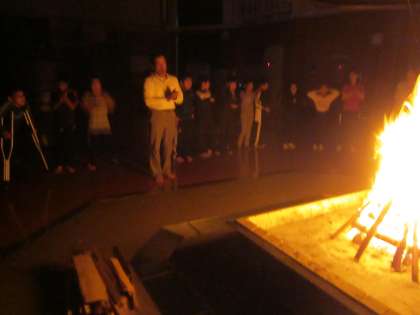 プレイホールでキャンプファイヤーをしました。火の神様からもらった火をまきに移し、大きな炎が燃え上がりました。その炎を囲んで、ゲームをしたり歌を歌ったりダンスをしたりして盛り上がりました。