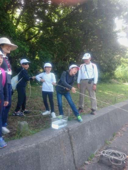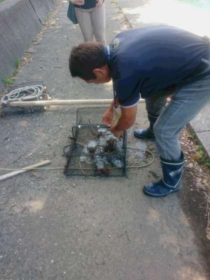 かご漁のかごを引き上げました。鞍馬小のかごには、カニやクラゲが入っていました。他には、オコゼやフグ、ナマコなどがとれて大漁でした。
