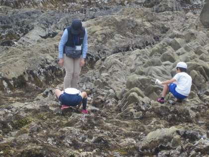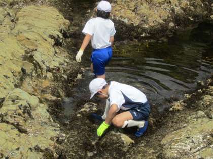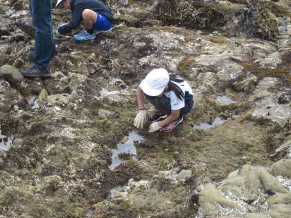 磯の観察をすると、ミズダコ、ヤドカリ、ウニ、ウミウシ、ナマコ、カニ、アメフラシ、そのほか小魚などたくさんの生き物が見つかりました。みんな目を輝かせて、ジャブジャブと海に入っていました。