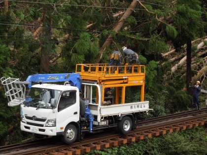 台風21号通過以来,叡山電車が不通となり,復旧の目途がたっていません。今日は,貴船口駅の近くで架線に倒れこんでいた樹木の枝を撤去する作業をされていました。倒木が多く,大変な作業です。見守ることしかできませんが,一日も早い復旧を祈るのみです。