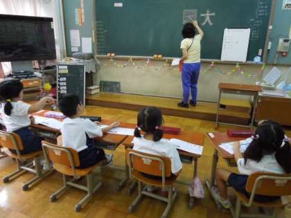 漢字の成り立ちや筆順,読み方,基本点画(とめ・はらい)を学習しました。筆順を指で空書しながら覚えます。1年生は漢字を80字学習します。これからも正しく覚え,丁寧に書くように頑張りましょう。