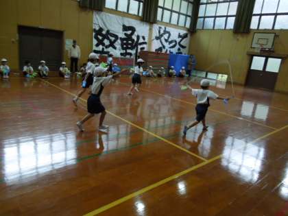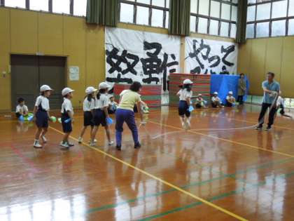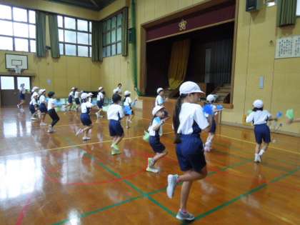 体育館で運動会の練習です。今日はダンスだけでなく,団体競技などの練習もしました。1年生は縄跳び・大繩がずいぶん上達しています。当日が楽しみです。