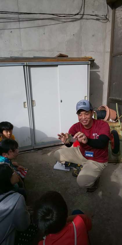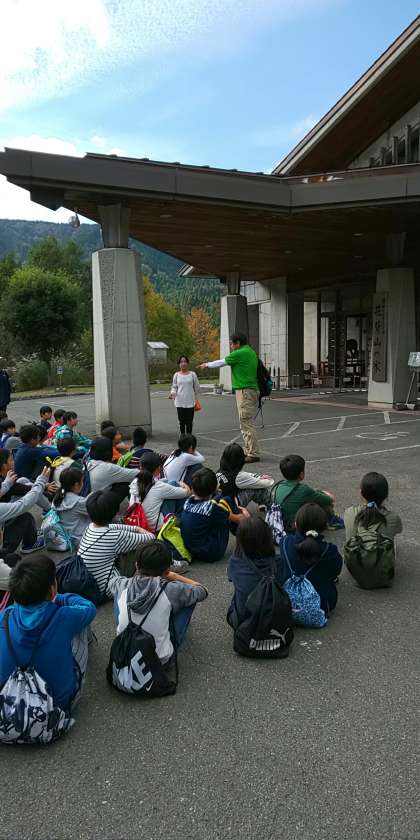 自然観察で、山の家の施設内を回りました。樹木、植物、生き物など、いろいろなことを教えてもらいました。