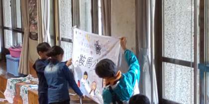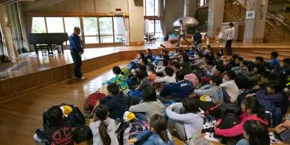いよいよ退所式です。担当は、田口校長先生でした。「無事にカエル」のかぶりもので、見送ってくださいました。