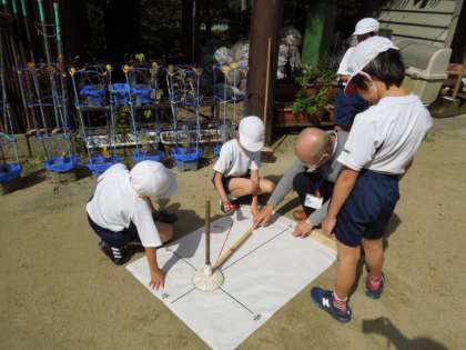 3年生の理科では,太陽の動きについて学習しています。1時間ごとに棒の影を模造紙に映してペンでなぞっていきます。影はどのように動いているでしょうか・・・。
