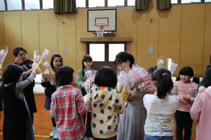 3月28日(木)、松井 康江先生と松下 奈央先生の二人の先生とお別れをする離任式を行いました。お二人の先生には、学校生活の様々な場面で大変お世話になりました。お別れするのが悲しくて、涙もいっぱい出ました。卒業生も含め、地域の方、保護者の皆様もたくさん来てくださり、優しく暖かな雰囲気に包まれた離任式になりました。松井先生、松下先生、ありがとうございました。