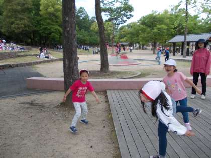 5月14日(火)、1,2,3年生は社会見学で、宝ヶ池公園に行きました。遊具は他校が到着する前に,貸切り状態で遊ぶことができました。満員になってからは,グラウンドが空いていたので,そちらに移動して遊びました。