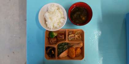 夕食は、お味噌汁にミートボールやひじきなど以前より品数が多くなったようです。おなかが減っていたので、おいしくいただきました。