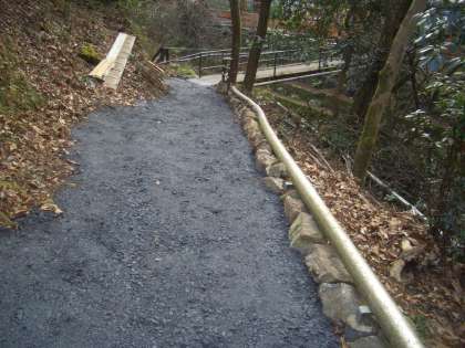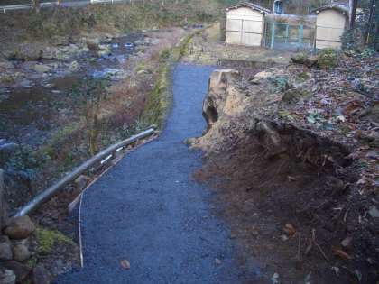 昨日、PTAの保護者の方や地域の方々の協力で、プール通路の整備をしていただきました。これまで石が転がっている山道でしたが、砂利を敷き詰め、固めて、とても歩きやすくなりました。川側は掘り出した石や板で流れ止めをし、山側は切り倒した木で落石防止の壁を作ってくださいました。