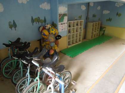 ここは,くつを はきかえるところです。くつを はきかえるときは きちんと そろえるように しましょう。 いちりんしゃや ぼうるも そばに おいてあります。