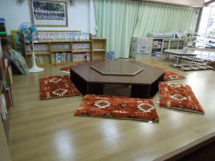 1ねんきょうしつのまえには そうごうがくしゅうしつが あります。6かくけいの おおきな つくえが あります。 ここでは,がくしゅうをしたり ほんをよんだり げえむをしたりします。これまでに くらましょうがっこうを そつぎょうされた かたがたが かかれた ぶんしゅう『くらまの こ』もありますよ。どこにあるか さがしてみましょう。