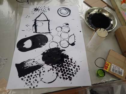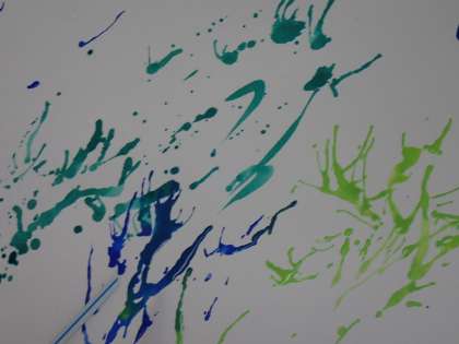 7月3日,図画工作の時間,絵の具のいろいろな技法を試しました。いろいろなものでのスタンピング,ドリッピング(画用紙にたらした絵の具を吹きとばし模様をつける),スパッタリングなど,とても楽しんで活動していました。次の時間,できた形を何かに見立てたり,たまたまできた模様を利用したりして作品を仕上げていきます。