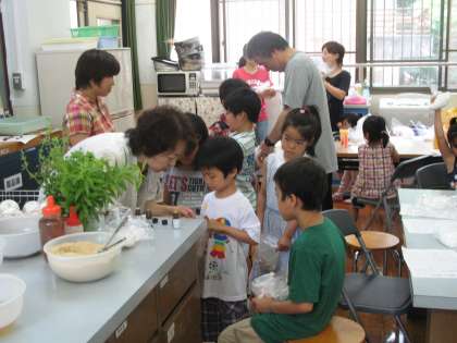 子どもも大人もいっしょにハーブ石けんづくりに熱中しました。