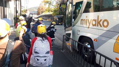 バスで移動する際,写真では少し見にくいですが,乗車前に確実に手指消毒を行います。車内でもマスクを着用しています。