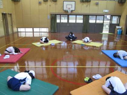 次はストレッチです。。写真の1枚目はその時の様子です。一人1枚マットに座り,長座体前屈などのストレッチを行いました。とてもリラックスした様子でした。