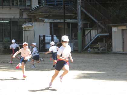最後は思い切り走りました。運動場に出て,2チームに分かれてしっぽ取りをしました。