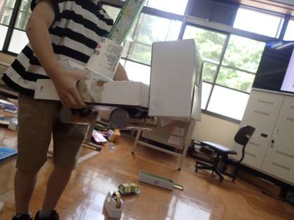 算数科で「いろいろな形」という学習を始めました。箱や缶を使って「はしご車」や「きりん」を作っているところです。重ねて積んだり,組み合わせたりして立体図形の特徴をつかんでいきます。