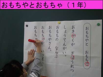 6月7日(月)国語で,小さい「や」「ゆ」「よ」の入った言葉を学習しました。教科書で確認した後,教室で小さい「や」「ゆ」「よ」の入った言葉探しをしました。「きゅうしょく」「ちゅうかんやすみ」「ぎゅうにゅう」「がっきゅうだより」などたくさん見つけることができました。明日は,「しょっき」など促音(小さい「つ」)と拗音(小さい「や」「ゆ」「よ」)が組み合わさった言葉を学習します。
