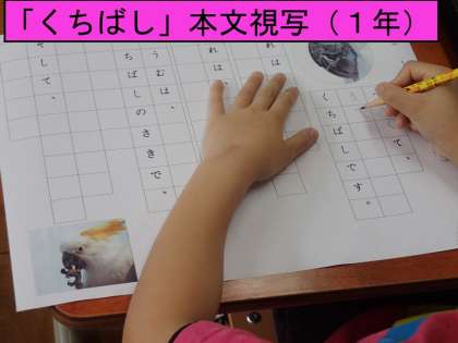 6月14日(月)国語科「くちばし」の学習で,授業の終わりに学習した部分を教科書を見て,書き写しました。「くちばし」の話には濁音(ば,が,ど,ば,で,で)や句読点(「、」「。」)や小さい「よ」などが出てきます。習ったことを,くり返し使うことで確実に身に着けることができるように支援していきます。