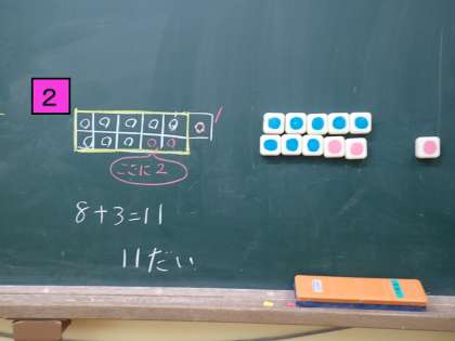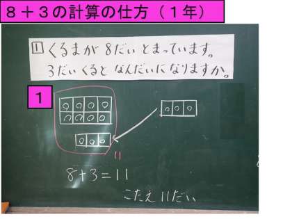 10月5日(火)算数で「8+3」の計算の仕方を学習しました。どのように計算したら,分かりやすいかを話し合いました。下の写真1より写真2で計算した方がやりやすいことに気づきました。明日からの学習でまたそれをいかしてほしいと思います。