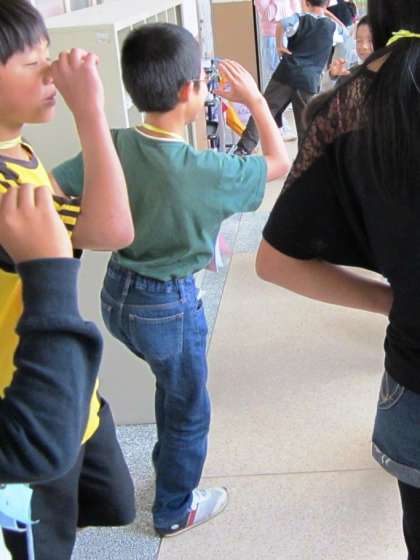 1枚目の写真は片足立ちが何秒できるかタイムを競っています。目を閉じて,片手は腰にあてて,飲み物を飲むような格好をするので,意外と難しいのです。