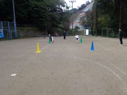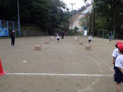 1・2年の体育は,「かけっこ・リレーあそび」の学習を始めました。2チームに分かれチームで競争します。コーンを回って走ったり,コーンをぬうように走ったり,段ボールをまたいだり,いろんなコースを作り競い合いました。とても白熱しました。