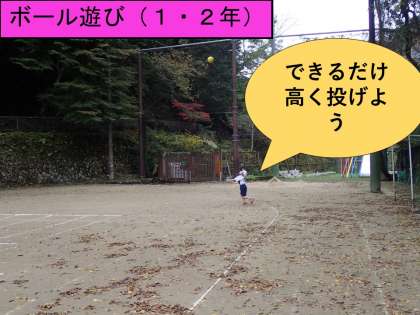 11月9日(火)1・2年の体育は「ボール投げ」「投げ遊び」の学習を始めました。