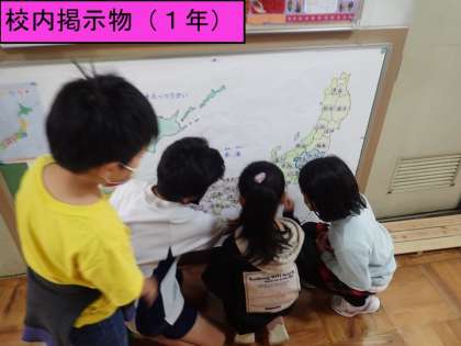 最近,校長室前の掲示物が都道府県地図になりました。地図の上の都道府県名が動かせます。5年生,6年生がさっそく都道府県名を動かし地図を完成させていました。