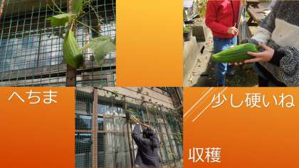 学校園に植えたへちまが,沢山なりました。春とくらべて葉っぱはどんな感じなのか,実はどれぐらいの大きさに成長したのか,観察しました。