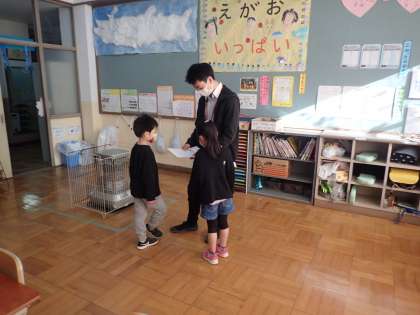 11月16日(火)教育実習生との最後の日でした。最後の時間は一緒に遊び,実習生にお手紙を渡しました。実習生からも,お話をしてもらいました。一緒にいろんな学習をしたり,お話をしたことなど子ども達にとってとても貴重な経験でした。保護者の皆様は,今日の様子や,今まで実習生としたことなどまた子ども達からお話を聞いていただければと思います。