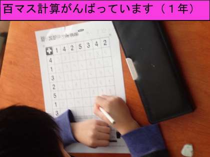 今週から1年生は100マス計算に取り組んでいます。やるたびに,記録が上がっているので大変意欲的です。楽しく計算力をつけらえるように支援していけたらと思います。