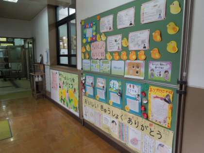 本校の給食週間は学年ごとの取組として,子どもたち一人一人が給食について考えました。給食調理員さんへの感謝を書いたものを,給食室前に掲示しています。