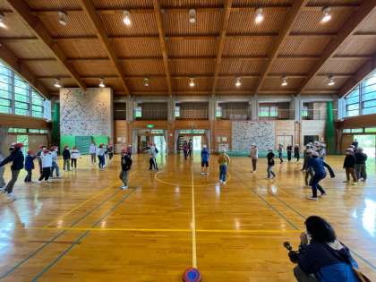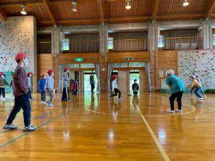 ボルダリングが終わり、プレイホールでドッジビーをしています。盛り上がってます!