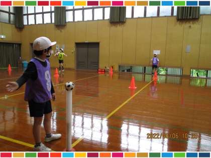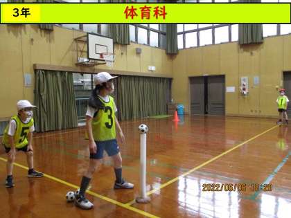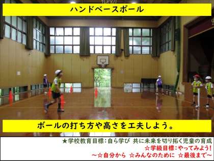 体育館で「ハンドベースボール」の打ち方を中心に取り組みました。