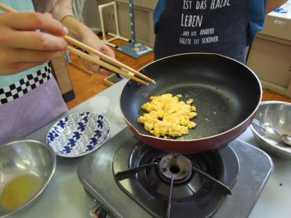 ピーマンを使った三色野菜炒めと炒り卵をつくりました。