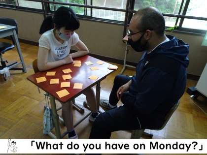 今日はカードを使って,ペアでゲームをしながら教科の名前を答えました。