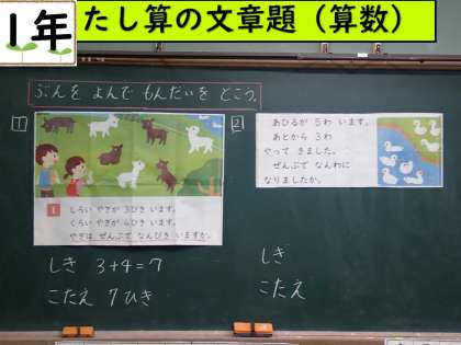 6月14日(火)1年生は,算数でたし算の文章題に取り組みました。