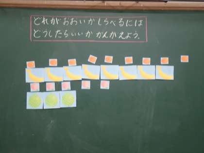 5種類の果物を黒板にはり,「どれが多いかを比べるにはどのように並べたらいいか」を考えました。