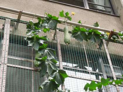 校舎の壁につたう、へちまの葉っぱや花をながめていると、大きく成長しているへちまを発見しました。