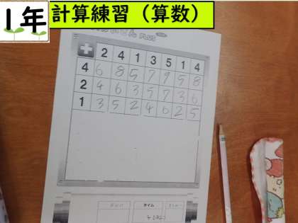 1年生は、毎日、算数科の授業のはじめに「くりあがりなし」(「3+2」「4+5」)の計算練習をしています。