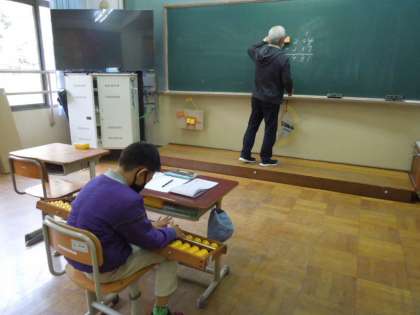 そろばんをつかって、小数の足し算の問題にチャレンジしています。