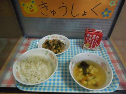「肉みそいため」には、大豆やしいたけのもどし汁を使っています。食べ物をむだなく使う工夫をしているこんだてです。