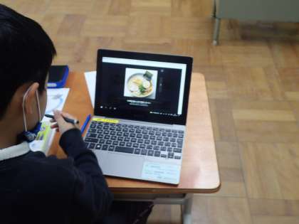 上の写真は、GIGA端末を使って、自分がお店に置きたい商品の写真やイラストを調べ、絵を描いているところです。