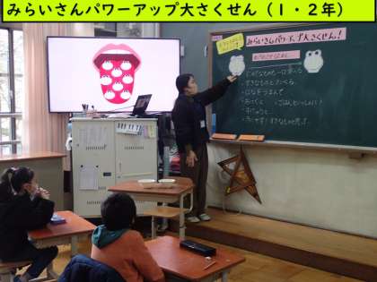 2月9日(木)1・2年は、「食の学習」で「みらいさんパワーアップ大さくせん」に取り組みました。