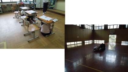 緊急地震速報が流れると、担任の先生の指示のもとに、地震から命を守る態勢をとりました。子どもたちは落ち着いた様子で訓練に参加できていました。