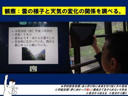 ・雲をタブレットなどで記録するときは、目をいためるので、太陽を直接見てはいけないこと。タブレットなどを使うときも、太陽を見ないように気を付けるなど、注意を確認してから、雲のようすと天気の変化の関係を調べていきます。