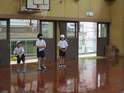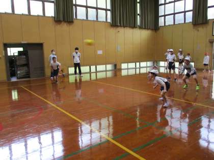低学年も高学年もみんな楽しそうに逃げたり、ボールを取ろうとボールの前に行ったり、投げたりとても楽しそうでした。