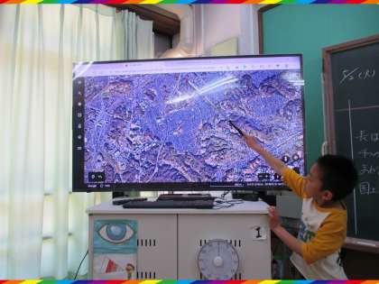 ・今日の学習では「世界で一番詳しい地球儀」Google Earthが大活躍でした。高い空から日本を見て、日本の地形について話し合い、学習問題を作りました。