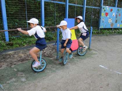 一輪車に乗ることが得意な子は、その場で乗車したまま停車する「アイドリング」という技に挑戦。バランスがとても難しい技ですが、少しずつできるようになってきました。